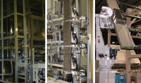 The loader takes unprocessed glass substrates from a tray one by one via a Cartesian coordinate robot and places them onto a production line. The inter-leaf papers between glass substrates are removed and shredded.